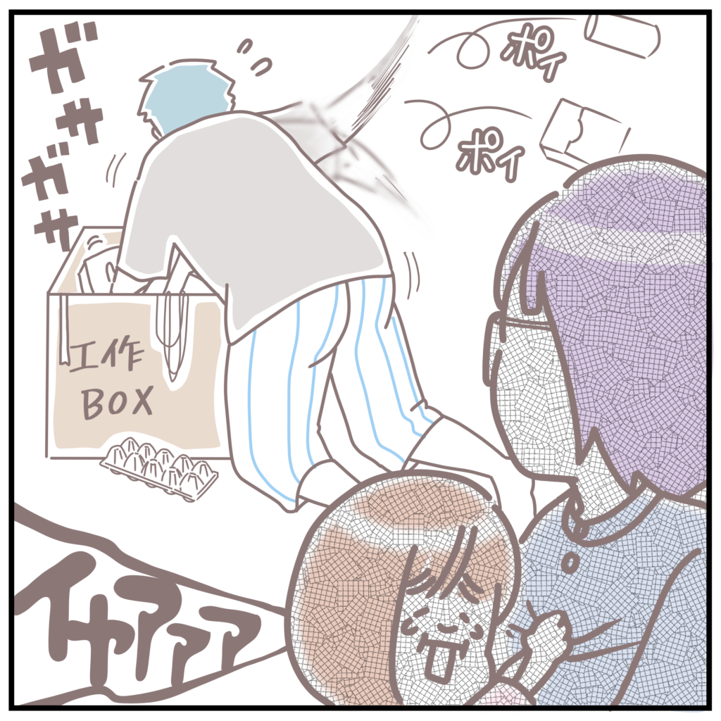 まさかの救世主が 紙コップ。パパが急にひらめいて、紙コップに穴をあけて“水が出るおもちゃ”をその場で作りはじめたんです。